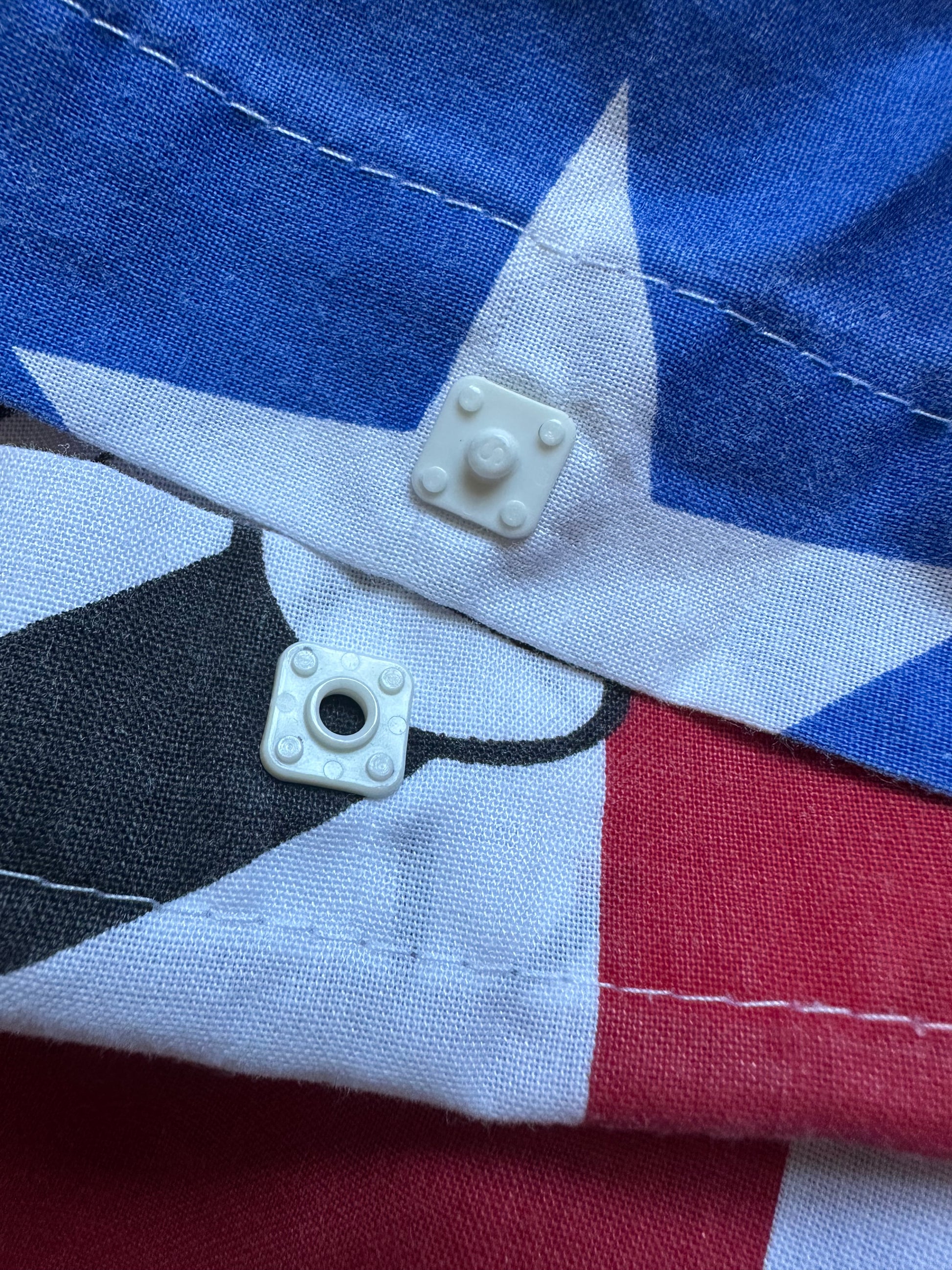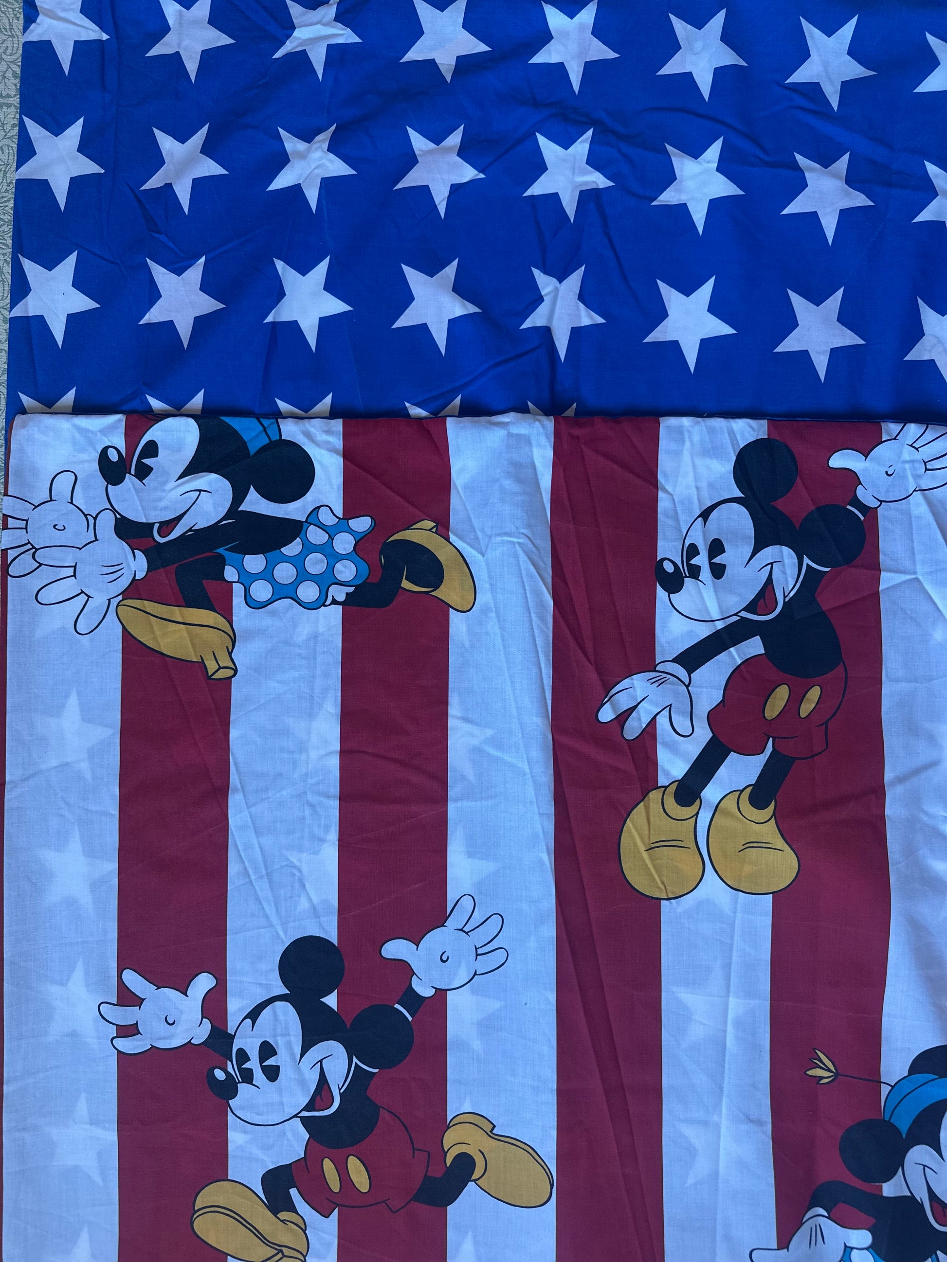 Minnie and Mickey on red and white stripes, white stars on blue reverse side. Pillow case features Mickey on one side, Minnie on the reverse.